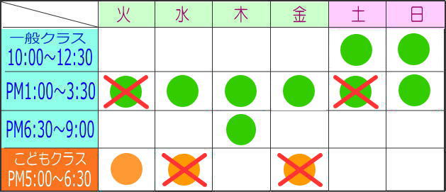 緑は開校日。赤は定休日。オレンジは臨時休校です。